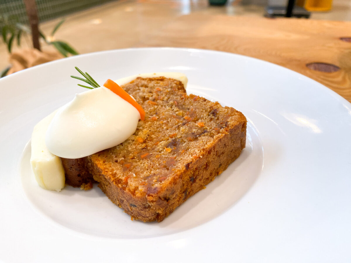刻んだ人参と白ワインで漬け込んだレーズンを生地に練り込み、クリームチーズのアイシングでコーティング。人参の飾り付けがポイント!