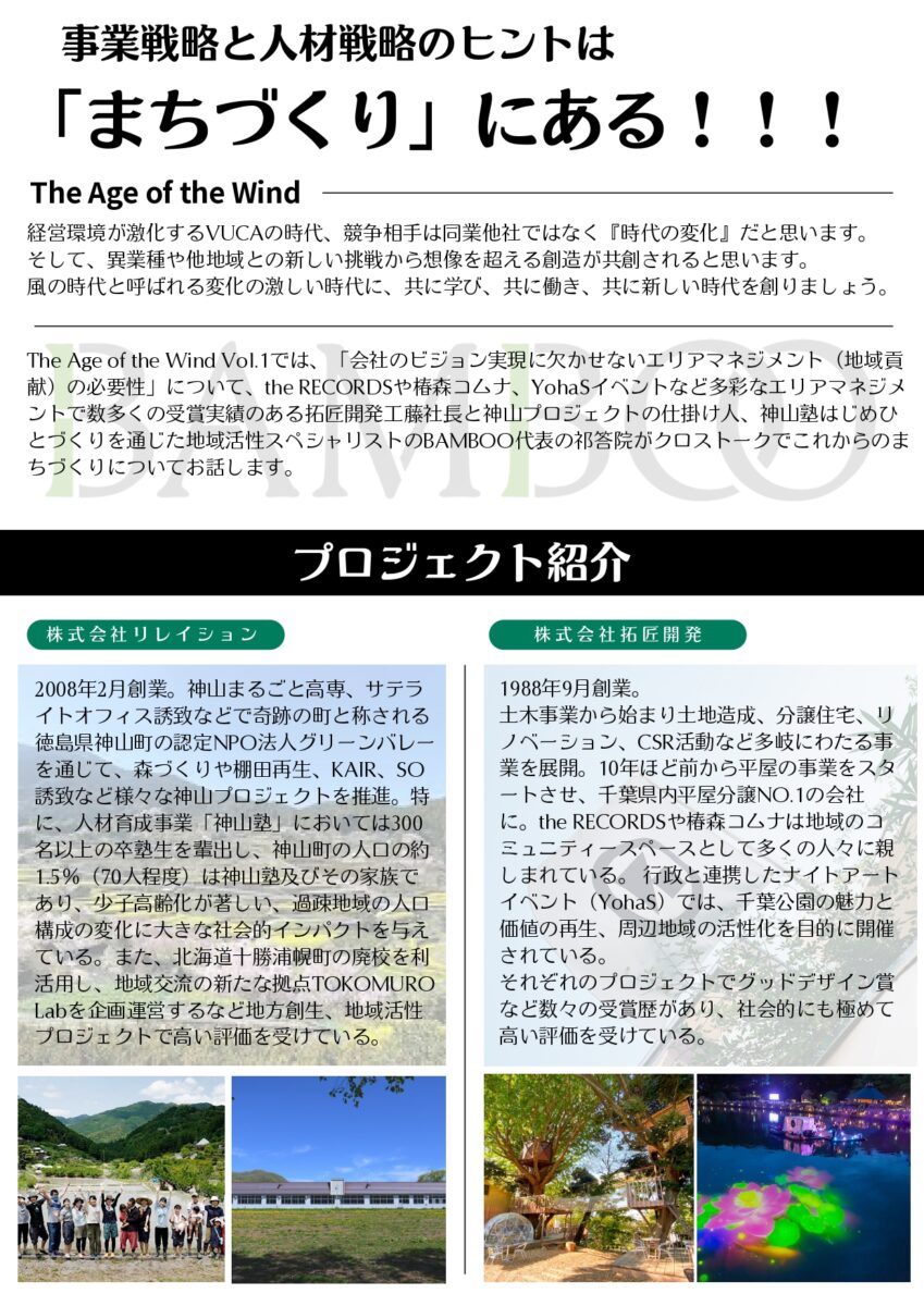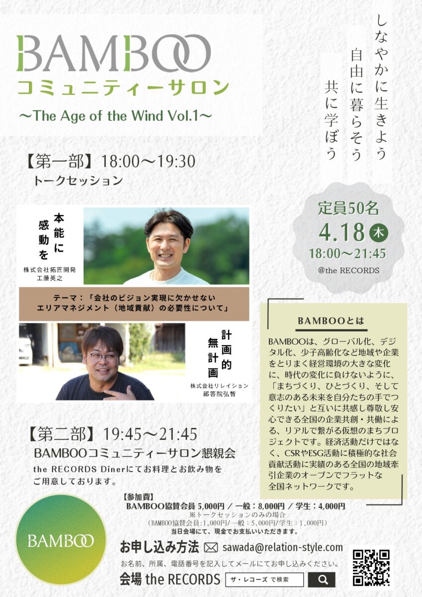 the RECORDSにて徳島県神山町の地方創生・地域活性のキーマン、株式会社リレイションの祁答院弘智氏主催の「BAMBOO」コミュニティーサロンが開催されます。