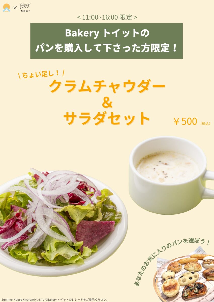 クラムチャウダー&サラダセットをワンコインでご提供!