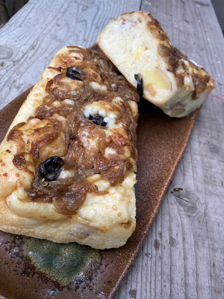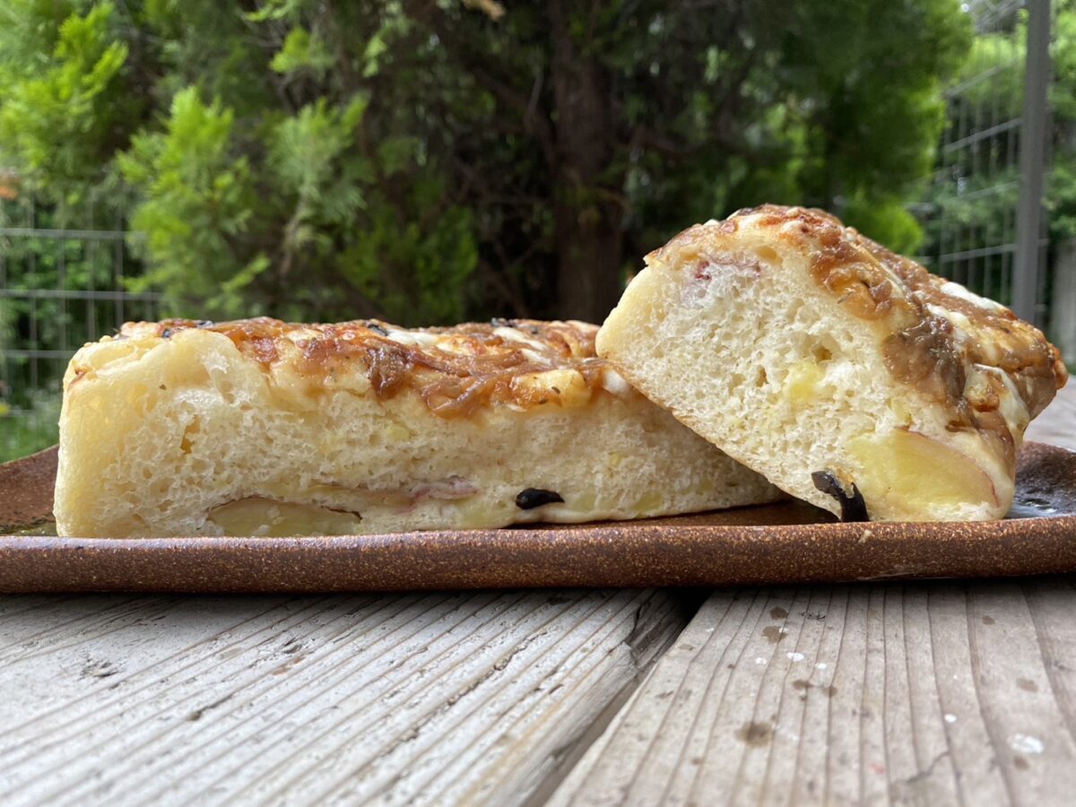 赤い皮に黄色い果肉でホクホクとして甘味を強く感じられる「アンデスレッド」とブラックオリーブをフォカッチャに混ぜ込み、