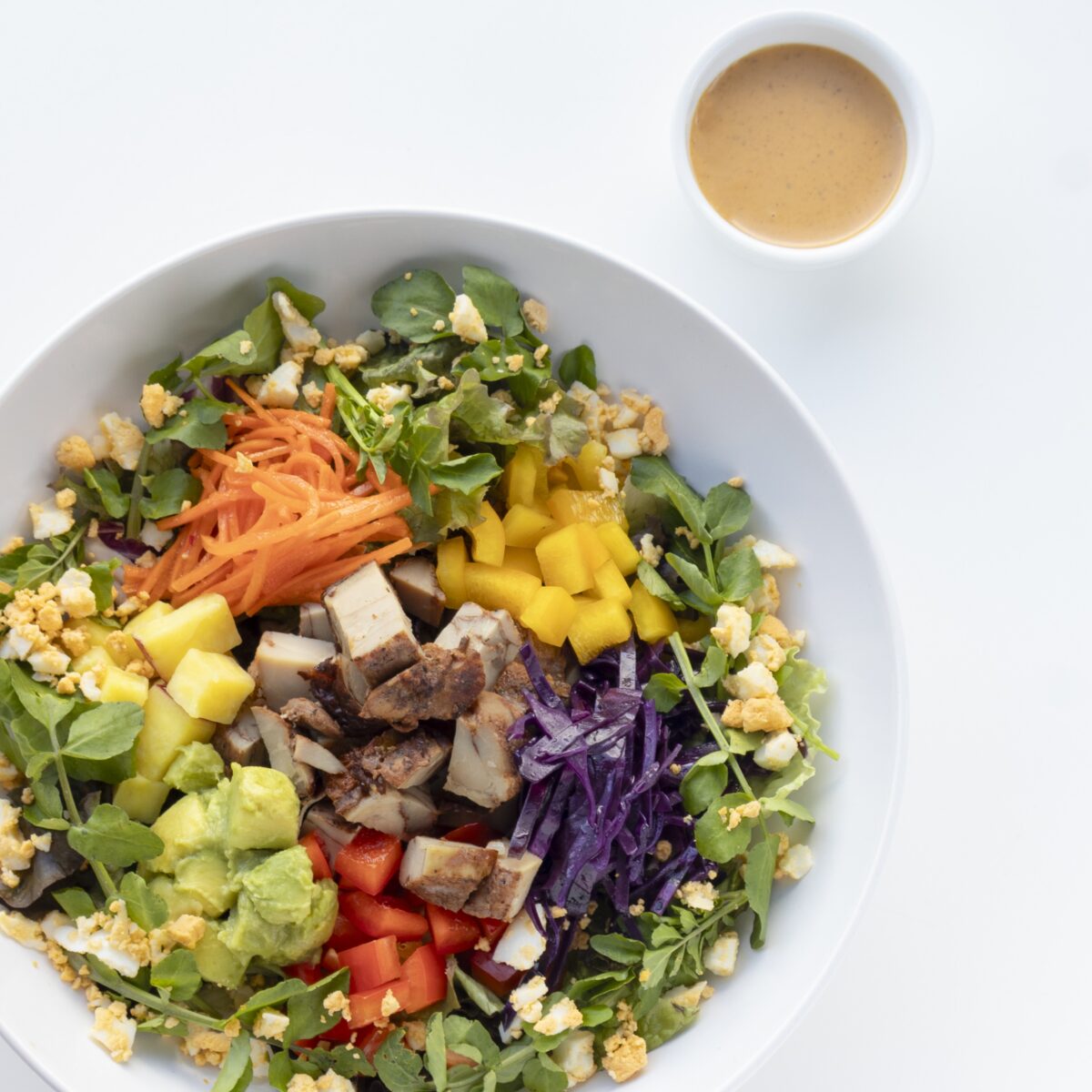 スパイシーなジャマイカンチキンと色とりどりの野菜たち、アボカドとホクホクさつまいもが一皿で楽しめる、食べ応え満点のごちそうサラダ。
