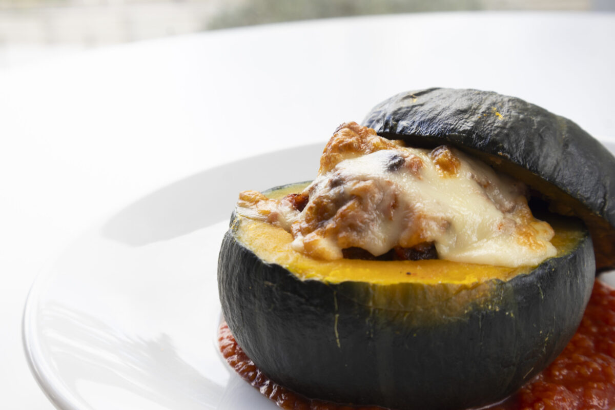 甘みのある坊ちゃんかぼちゃに、ジューシーな挽肉とナスの具材、とろけるチーズと酸味のあるトマトソースが重なる、冬ならではのあったかグラタン。