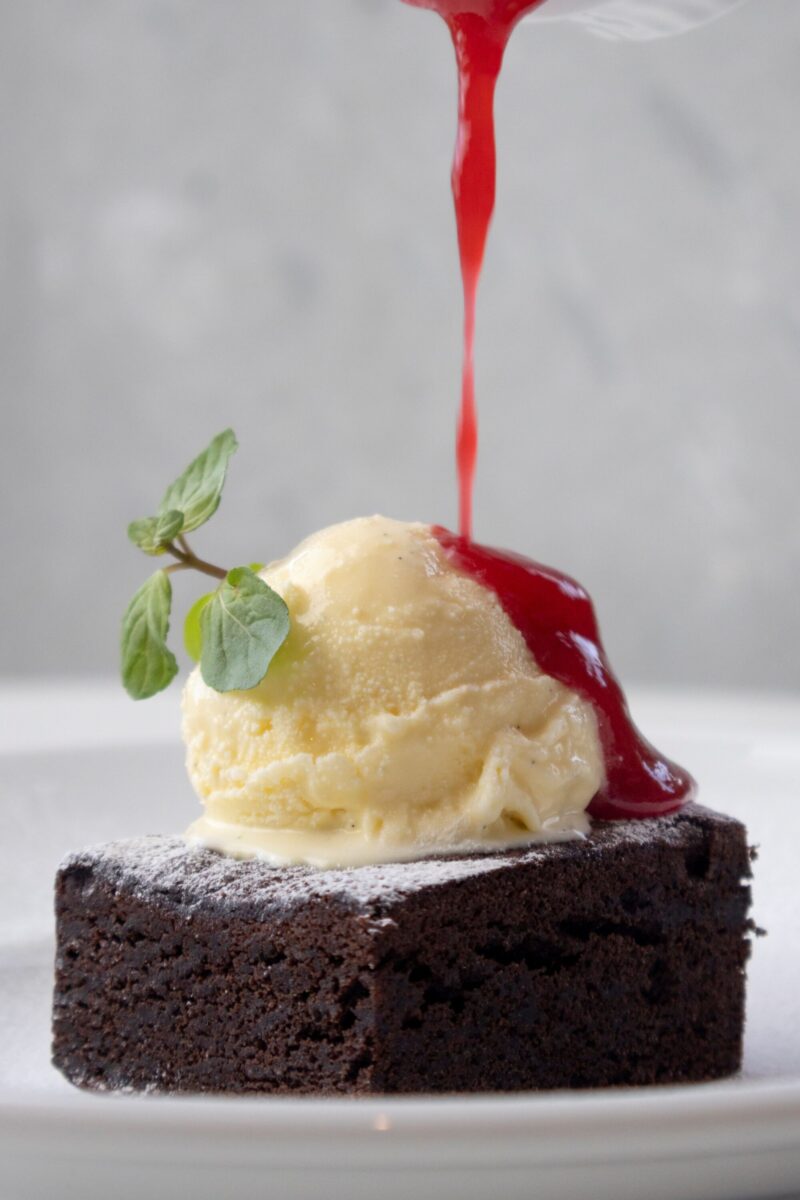 温×冷スイーツ!しっとり濃厚なブラウニーの温かさが冷たいバニラアイスを溶かし、甘酸っぱいラズベリーソースが絶妙なハーモニーを奏でる至福のデザート。