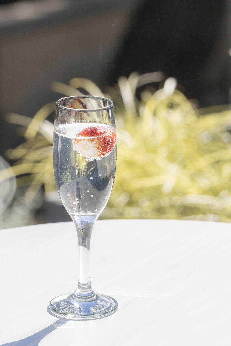 さっぱりとした日本酒のソーダ割りに、みずみずしいフレッシュいちごを添えました。