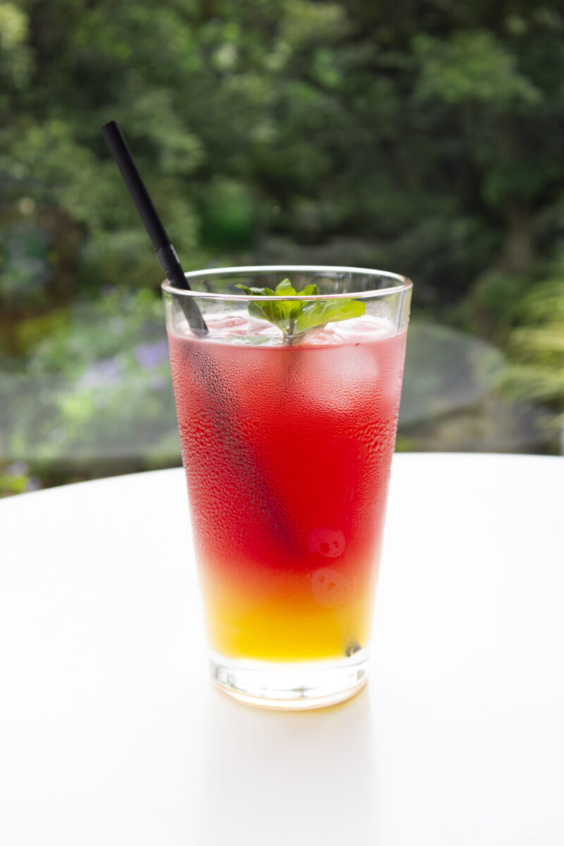 南の島を思わせるオレンジとマンゴーに、ローズヒップハイビスカスのアイスハーブティーを合わせた、酸味と甘さが絶妙にハーモニーを奏でる爽やかドリンク。